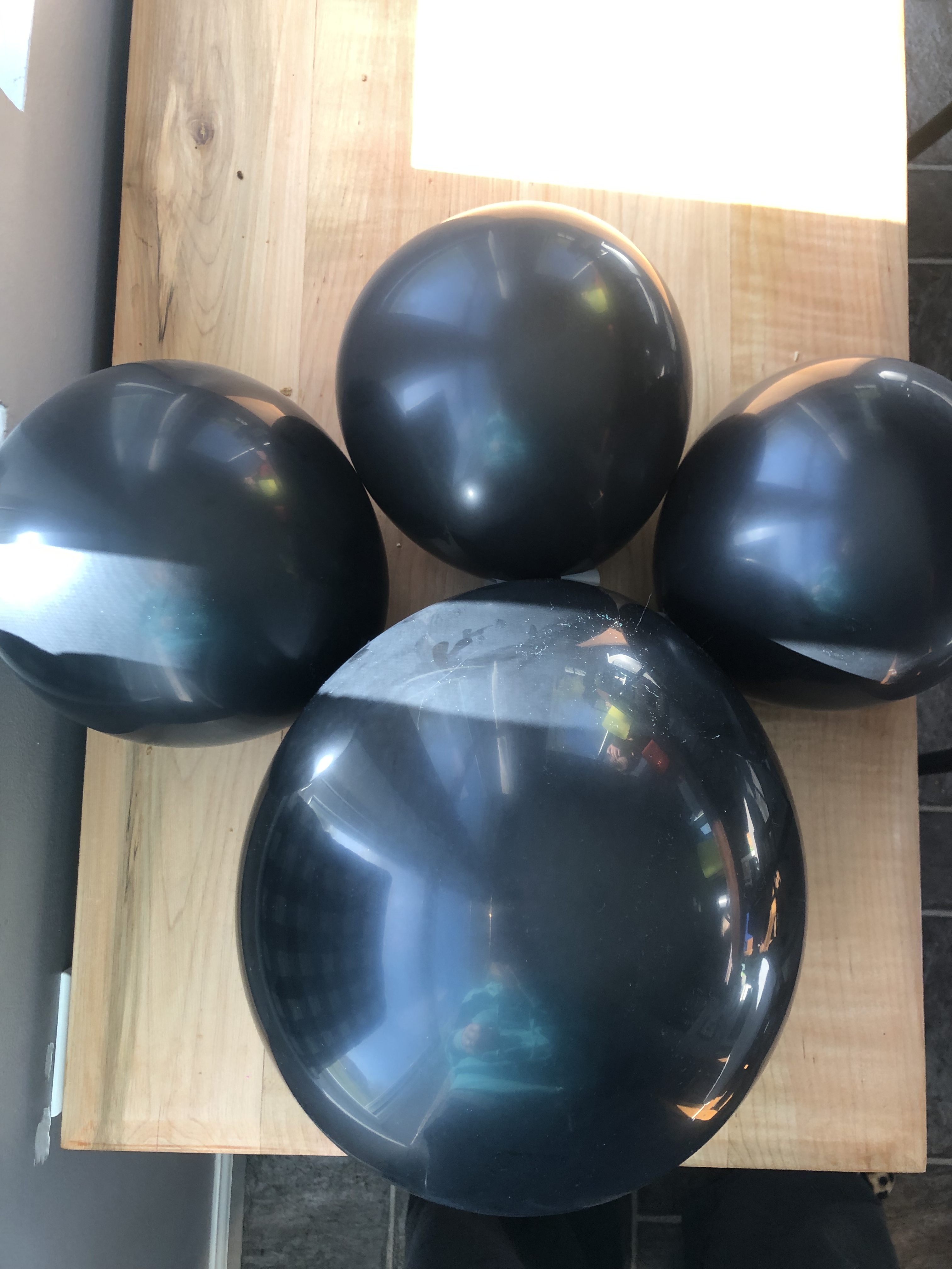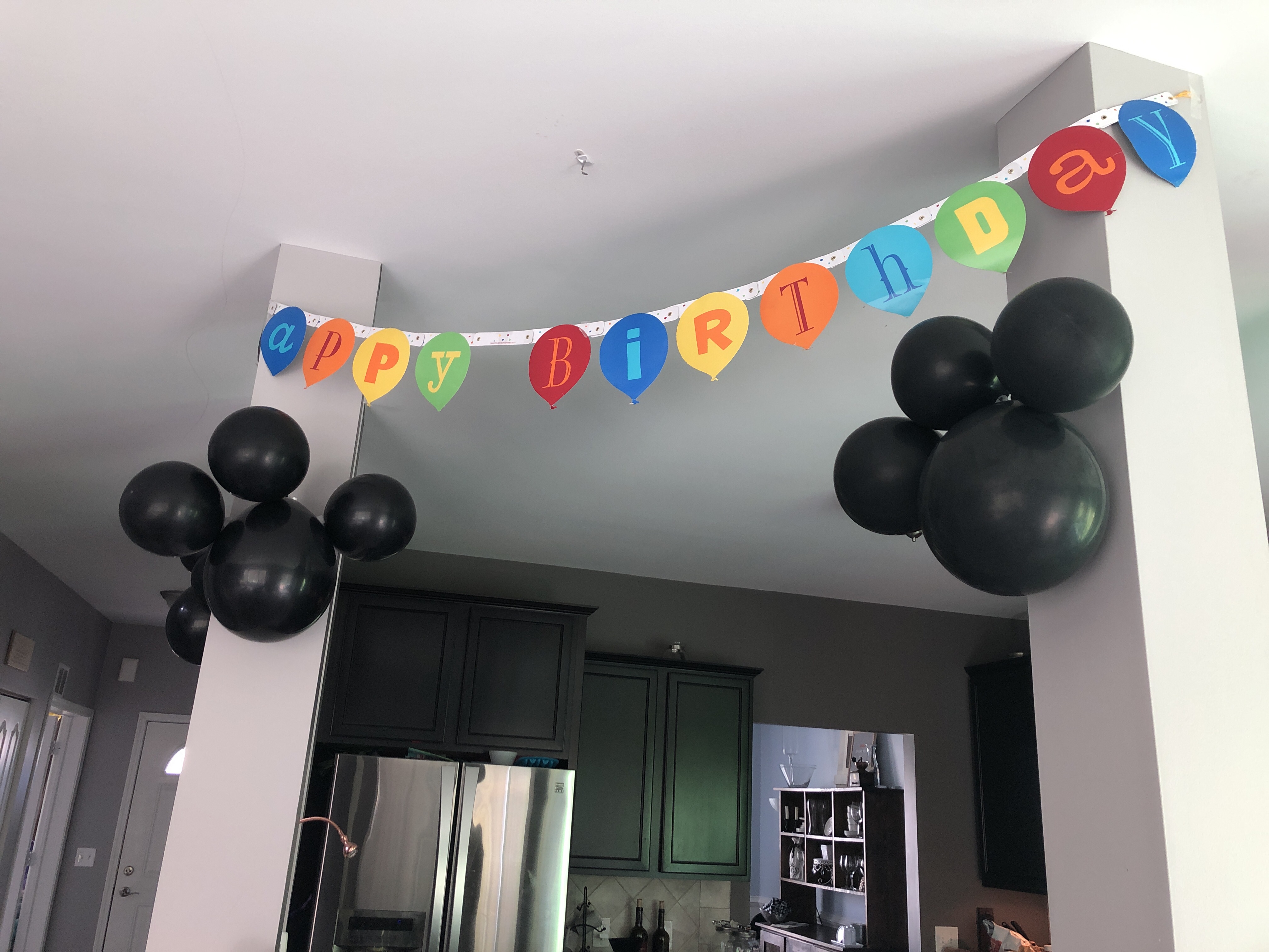 Paw Balloons! I’m not a huge fan of purchasing lots of licensed decorations- I love to get creative so I bought a pack of black balloons and blew them up to two different sizes- one bigger and three smaller. Regular clear tape did the trick to get the to stick to one another. Getting them to stick to the wall was actually much more complicated!