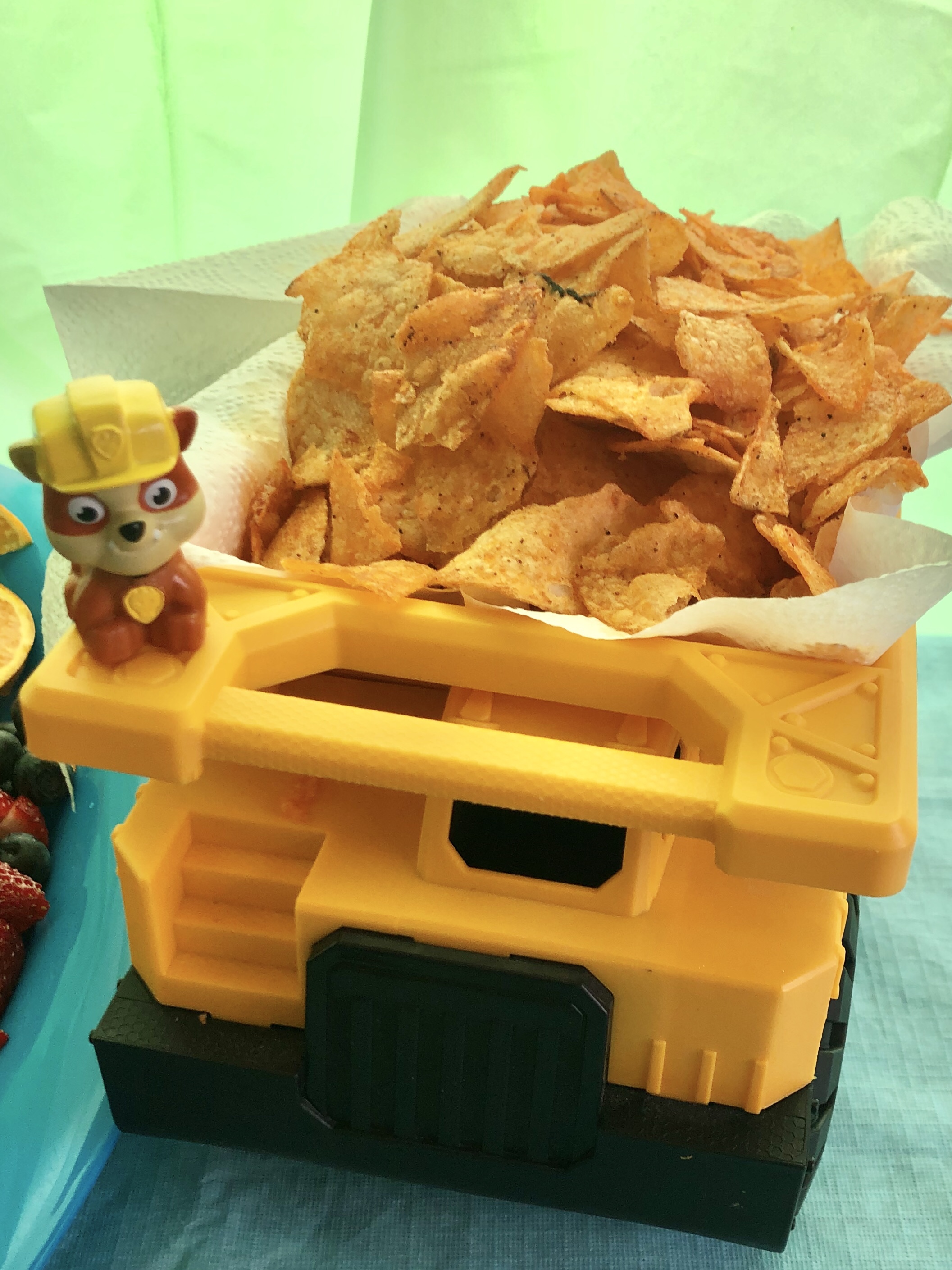 Who doesn’t want to eat chips out of a dump truck!? Rubble stood guard of his cargo- but these chips still got gobbled up fast! Food vessels don’t have to be cake stands and bowls. 😉