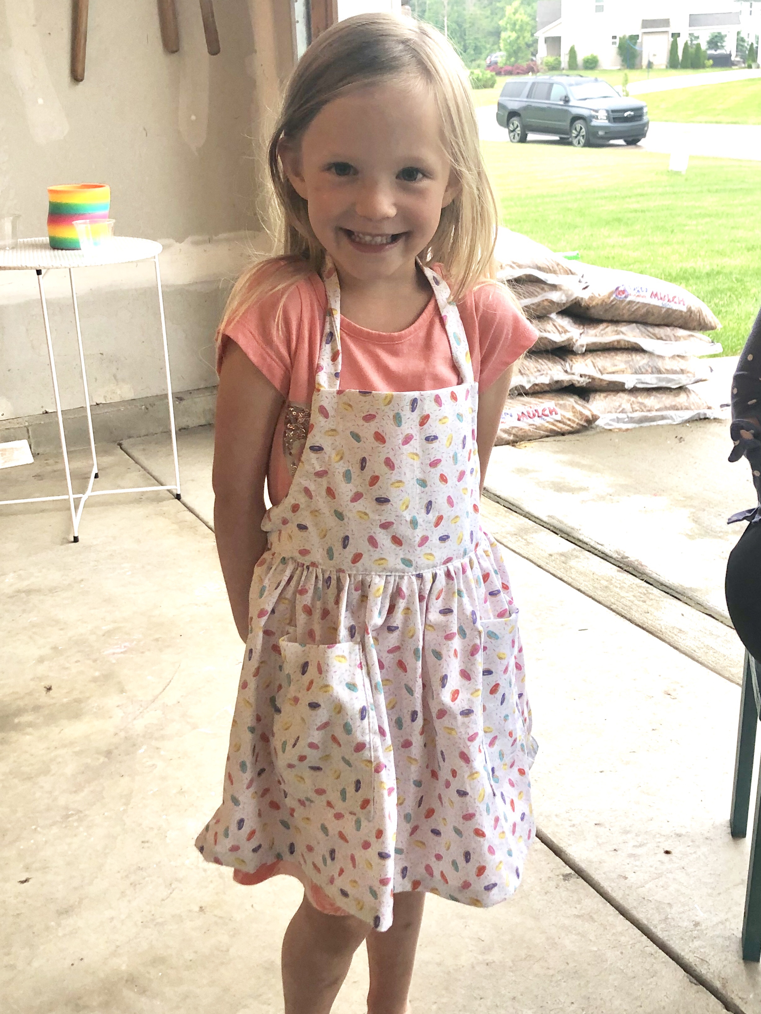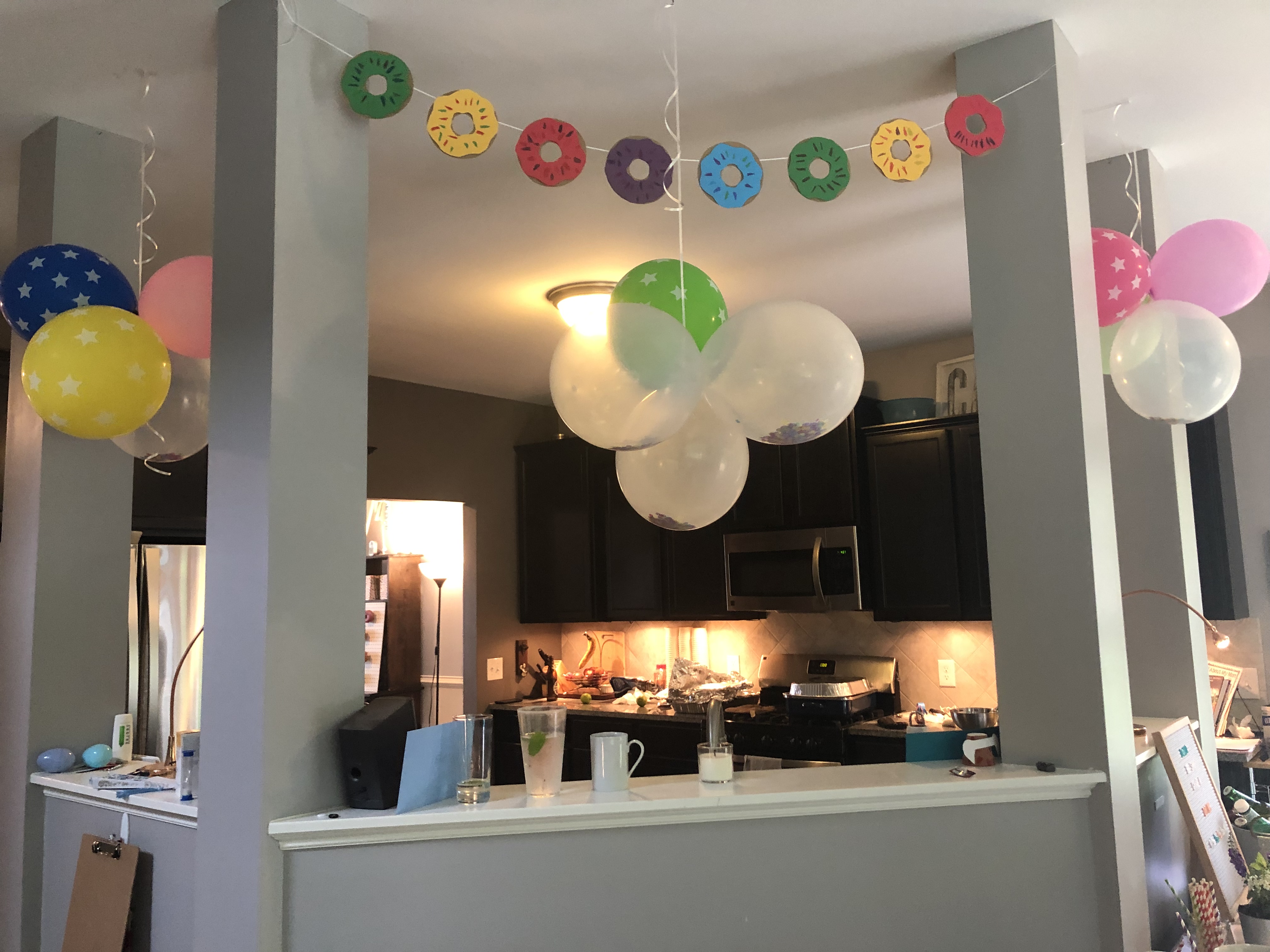 The kids always want to help with decorations and crafts for their parties. The control freak in me wants everything to look perfect so this occasionally leaves us with a dilemma. Giselle and I worked together on this donut banner; I cut the shapes and she colored the sprinkles on top. Best of both worlds right there.