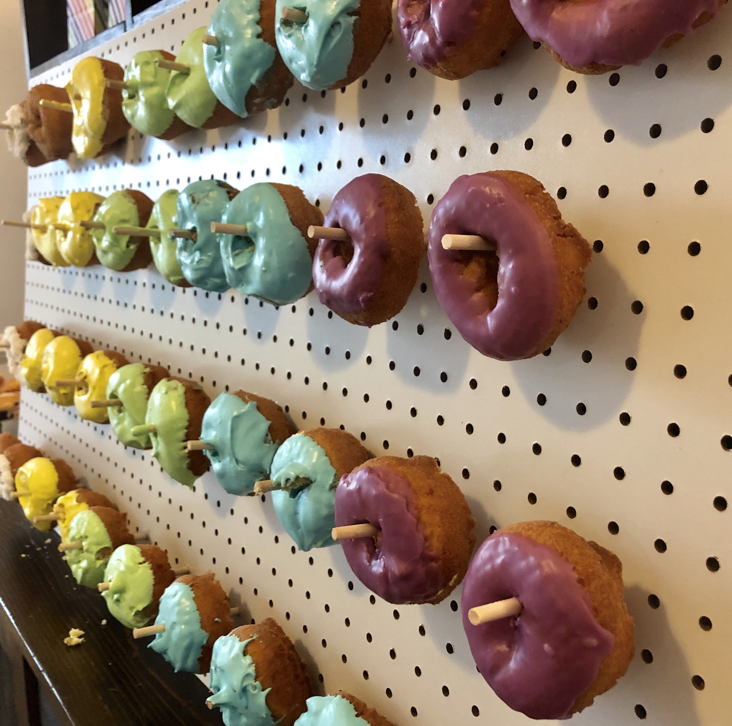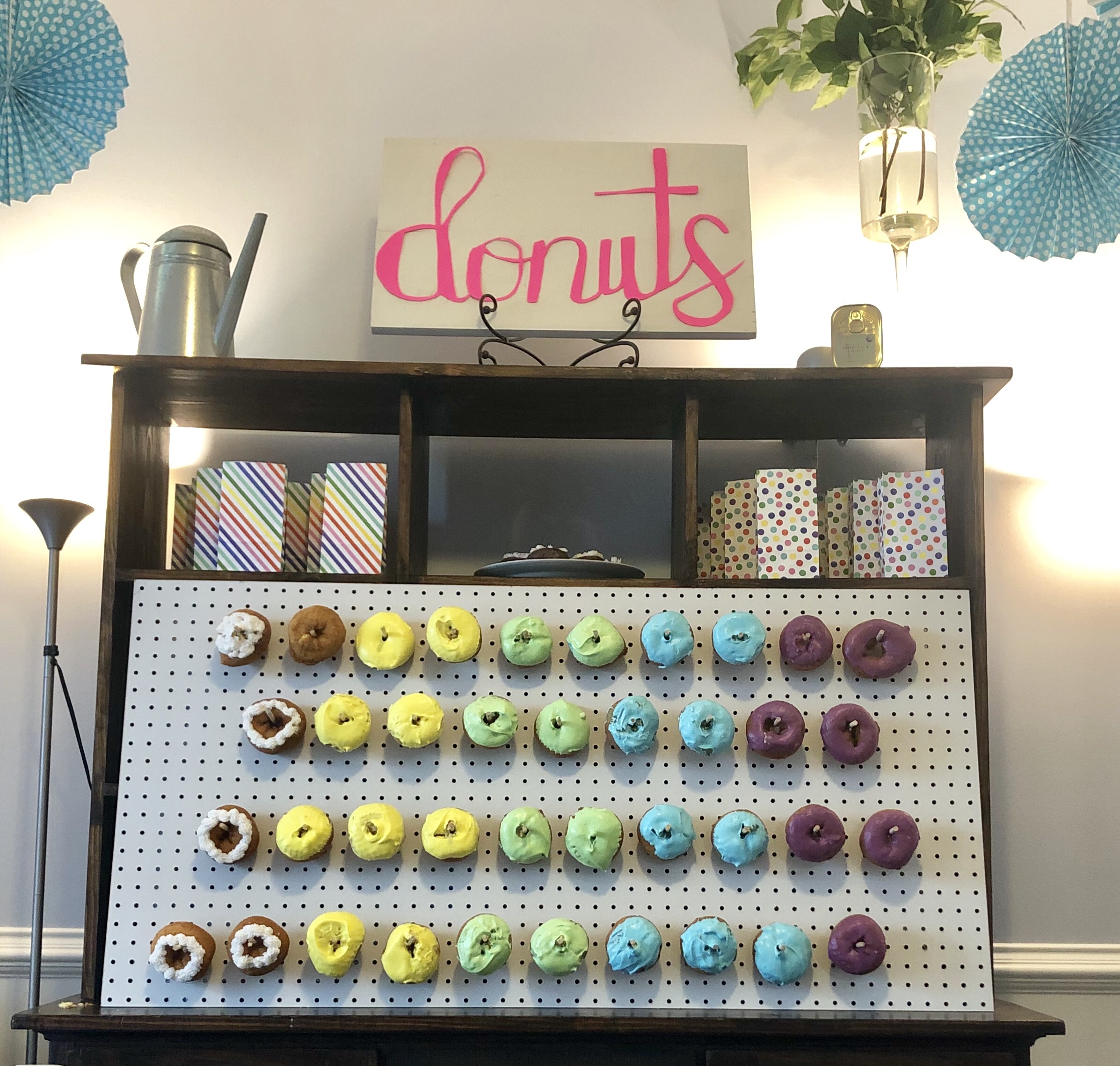 Our local bakery makes AMAZING donuts- but they’re not big on decorations. So I ordered dozens of plain cake donuts and made and dipped my own colorful frosting! Colorful little paper bags worked both as decoration and “to-go” vessels for left over donuts. Win win!!