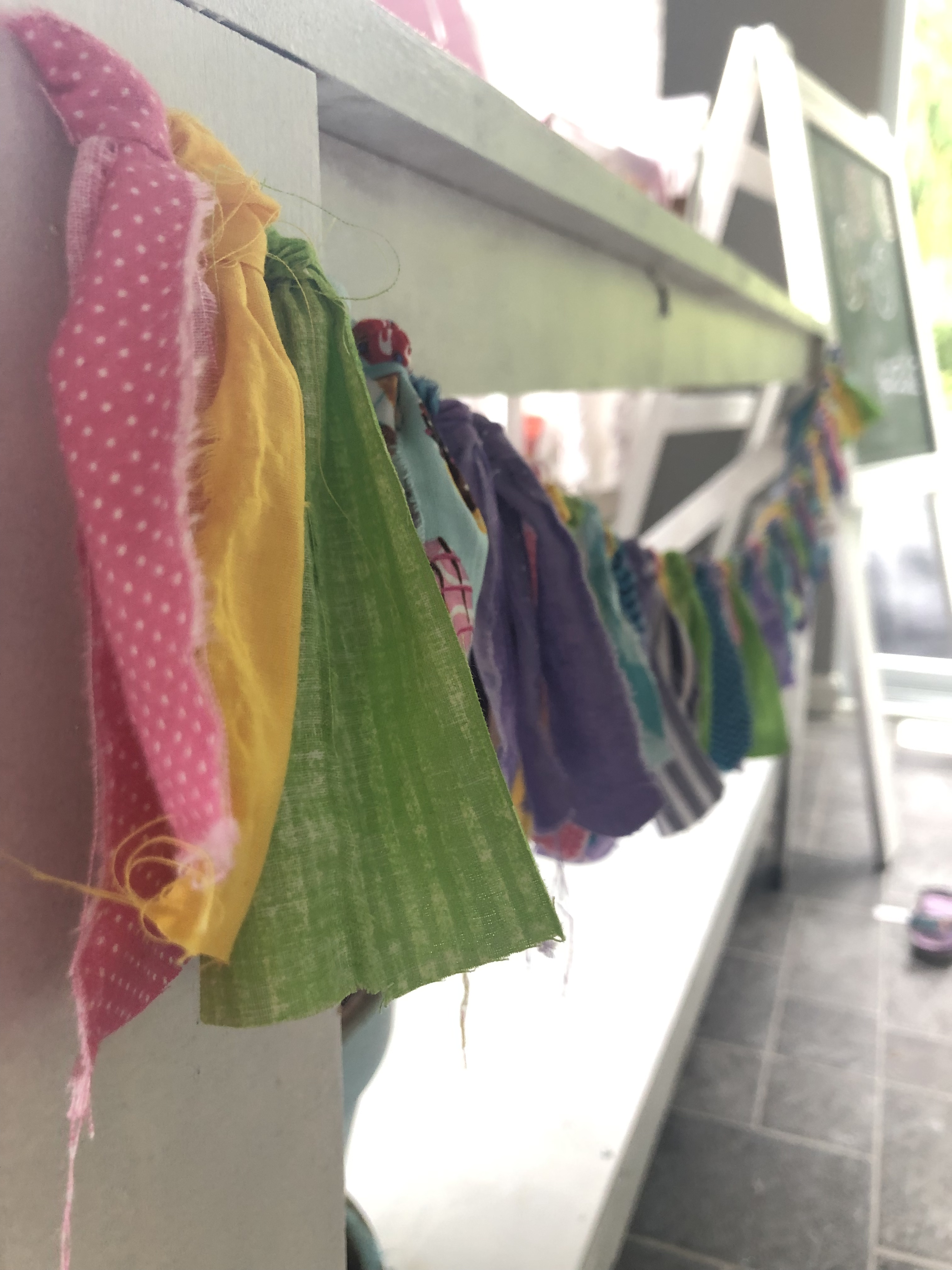 I made a fringe banner with rainbow colors and donut fabric. Just for my rainbow donut girl. And bonus: nowthat the party is over, it hangs it her closet!