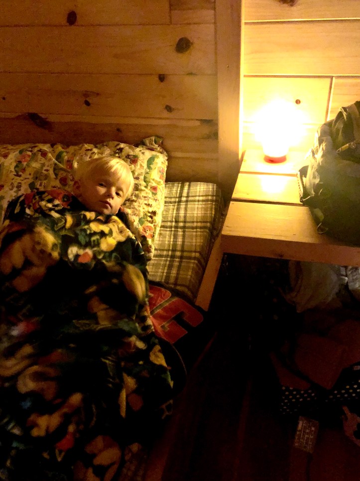 When we got back to the cabins, we had a campfire and some heavy bedtime snacks. The kiddos got tucked into sleeping bags and the adults enjoyed some relaxing (but cold) time around the fire.