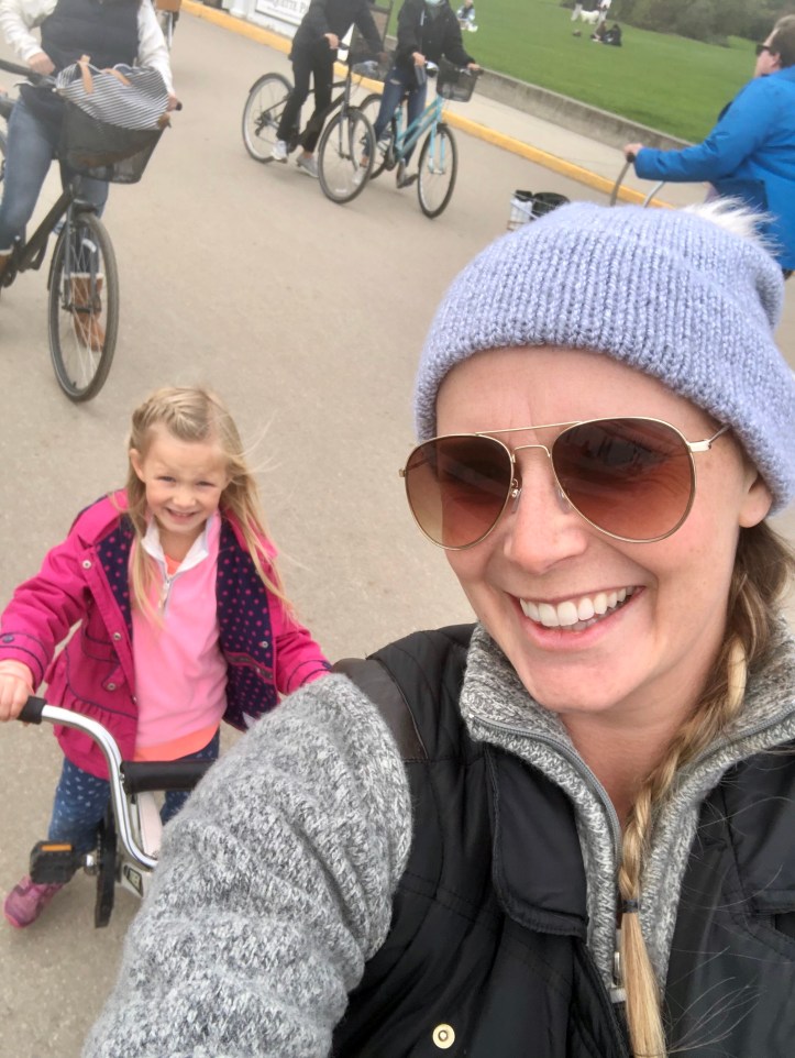 After our normal late morning donut snack (Erik picked up a large box of donuts in Mackinaw City before we boarded the ferry) we headed over to the place we have rented bikes nearly every visit we have ever made to the island. Giselle and I shared a tag-a-long bike which is a third wheel that attached to the back of my bike. While she was able to assist in some pedal power, she also had her own handle bars which resulted in nearly spilling us over several times. By the end of the ride, my wrists hurt from working so hard to stabilize her wacky steering. Erik got a bike with a trailer for Torsten, and for the second time, Annabelle had a bike to power around the island on her own. My brother and his girlfriend always rent a tandem bike, which I love. It’s the quintessential couples choice for bikers on the island.