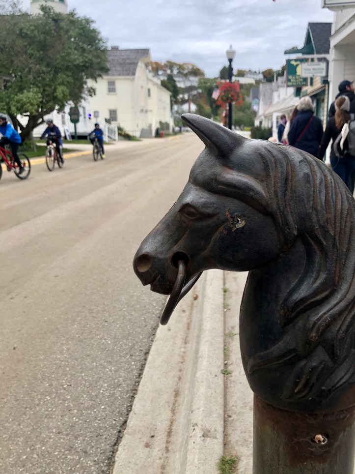Mackinac Island is filled with history so as you stroll through town there is so much to take in! One of my favorite nods to the past are these places to tie up your horse that line most of the streets in town. In addition to the old buildings, statues, and landmarks, there also happens to be a plethora of beautiful landscapes and flower gardens. Combine all of that with the horses, carriages, and bicycles and you’ll see that Mackinac Island is dripping with charm.