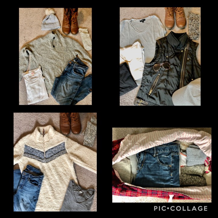 Here’s what I packed for myself. I find that if I stick to a color scheme it helps me to pack lighter and it simplifies the process. My gray hats and vest coordinated with everything I packed and I only brought one pair of boots. Also, I was crazy pumped about these boot socks I found on sale at Costco right before the trip. I loved the colors, the warmth, and the fact that I had a pair for every outfit.
