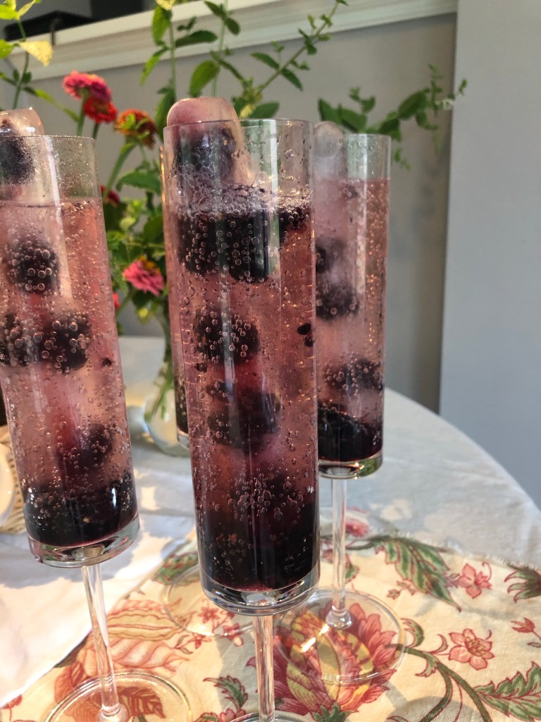 We kept refreshments SUPER simple (which is also very out of character for me). We made some fresh fruit kebabs, tied ribbons on chilled bottled water, and we made a special “spa fancy drink” for each girl. Keep in mind that everything looks fancier when you put it in the right glass 😉 The spa beverages were: muddled fresh black berries, half a pump of vanilla Torani syrup and sparkling water. We had also frozen some fresh berries in a tall cylindrical ice mold ahead of time for some extra fanciness.
