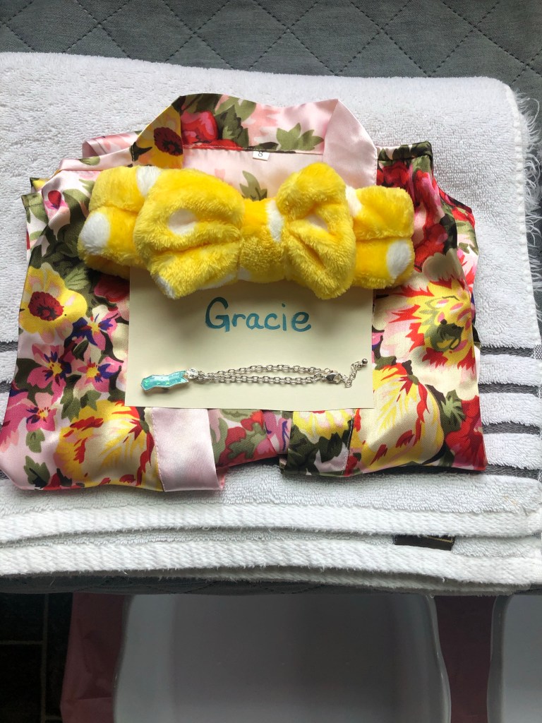 Because we kept the group small, it lent beneficial to being able to spoil the girls a little extra too. I got each girl these satin robes and spa head bands. They served as spa party wear as well as party favors; I love a double duty item! Annabelle also used her own money to buy a three part BFF bracelet to share with her friends. I love that those things are still around!