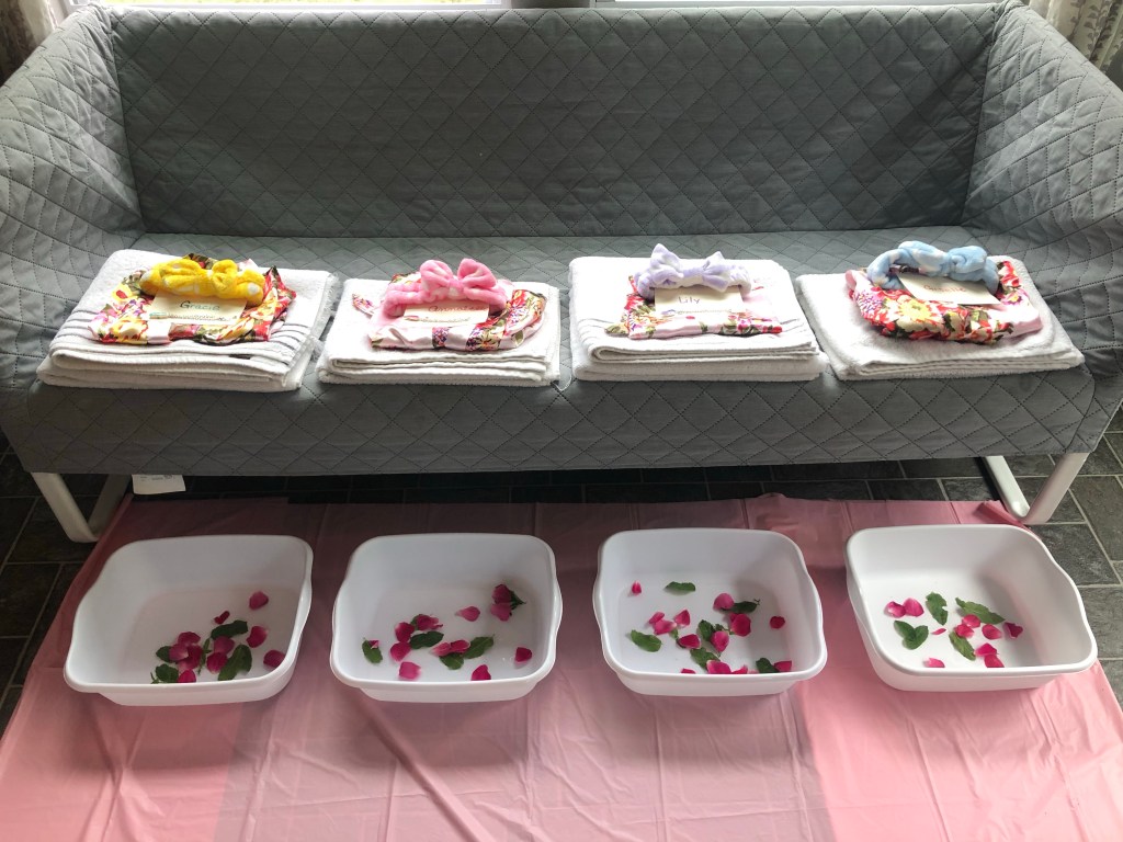 I bought plastic table cloths (to contain the mess) and these white dish tubs from the dollar store which fit their little feet perfectly. Honestly, all I did was grab mint leaves and rose petals from my backyard garden. It was cheap, beautiful, and fresh! I also added a couple drops of essential oils into the foot baths as well.