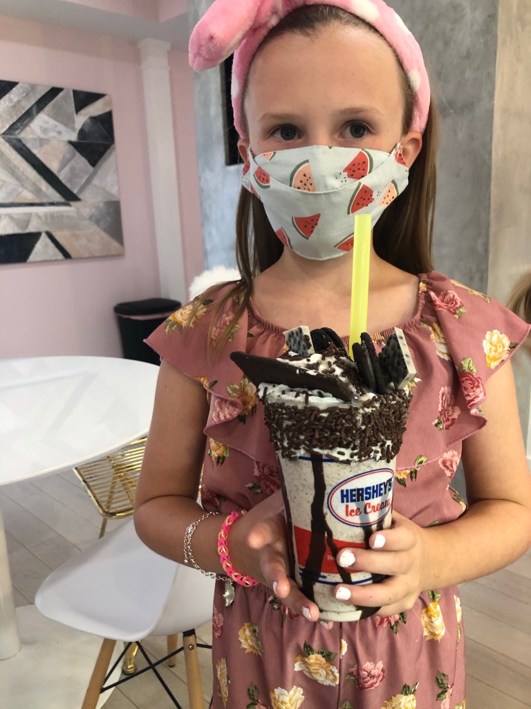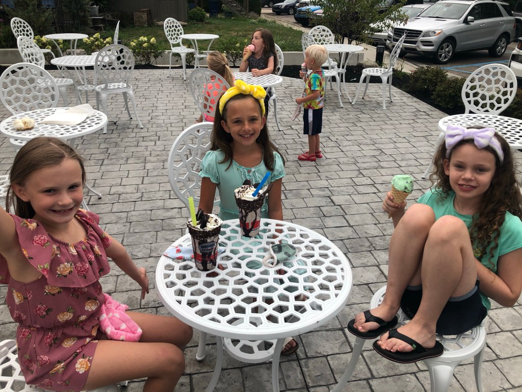 Once they were done with their spa, pizza, and gift opening, we all piled in the van and I drove them to a nearby ice cream parlor. Each girl picked her own treat and we all sat on the patio and enjoyed the fresh air and sweets. It was so easy and so fun. Possibly the easiest party I’ve ever done. Annabelle and her little gal pals had a great time and the best part is that they will have those memories forever.