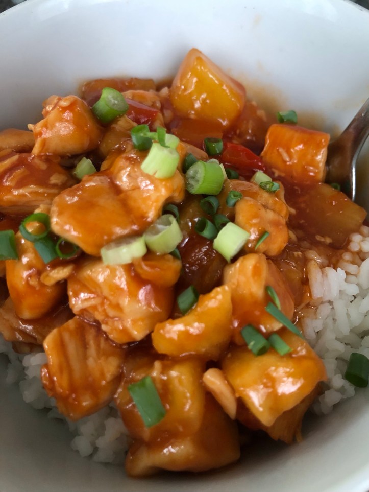 Bring the sauce and veggie mixture to small bubbles – NOT a full on boil. Pour the contents of your skillet over the chopped chicken in the large bowl and toss to fully coat. Serve over rice and garnish with chopped green onions. Enjoy!