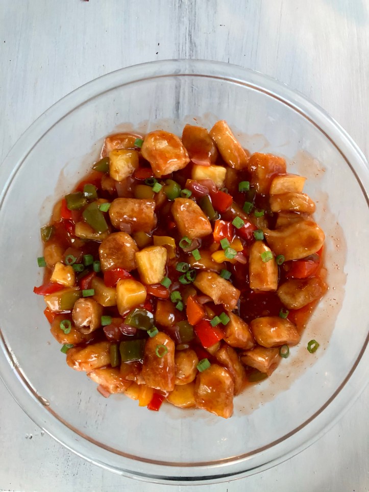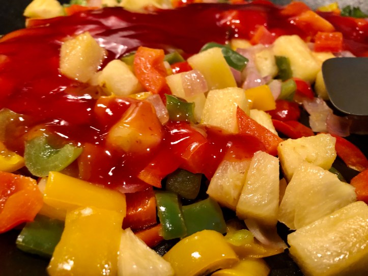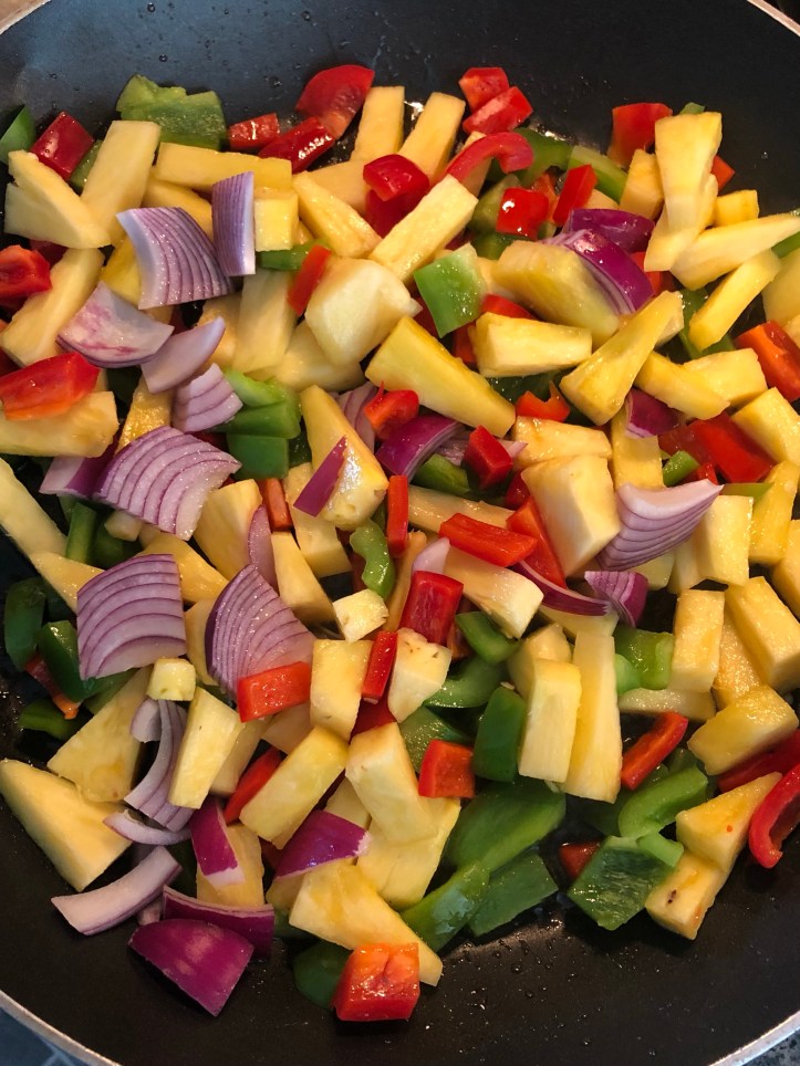 Pour the sauce over the sauted peppers, onions, and pineapple. Choose veggies that your family loves and will eat – but remember the more colorful the healthier and more beautiful!