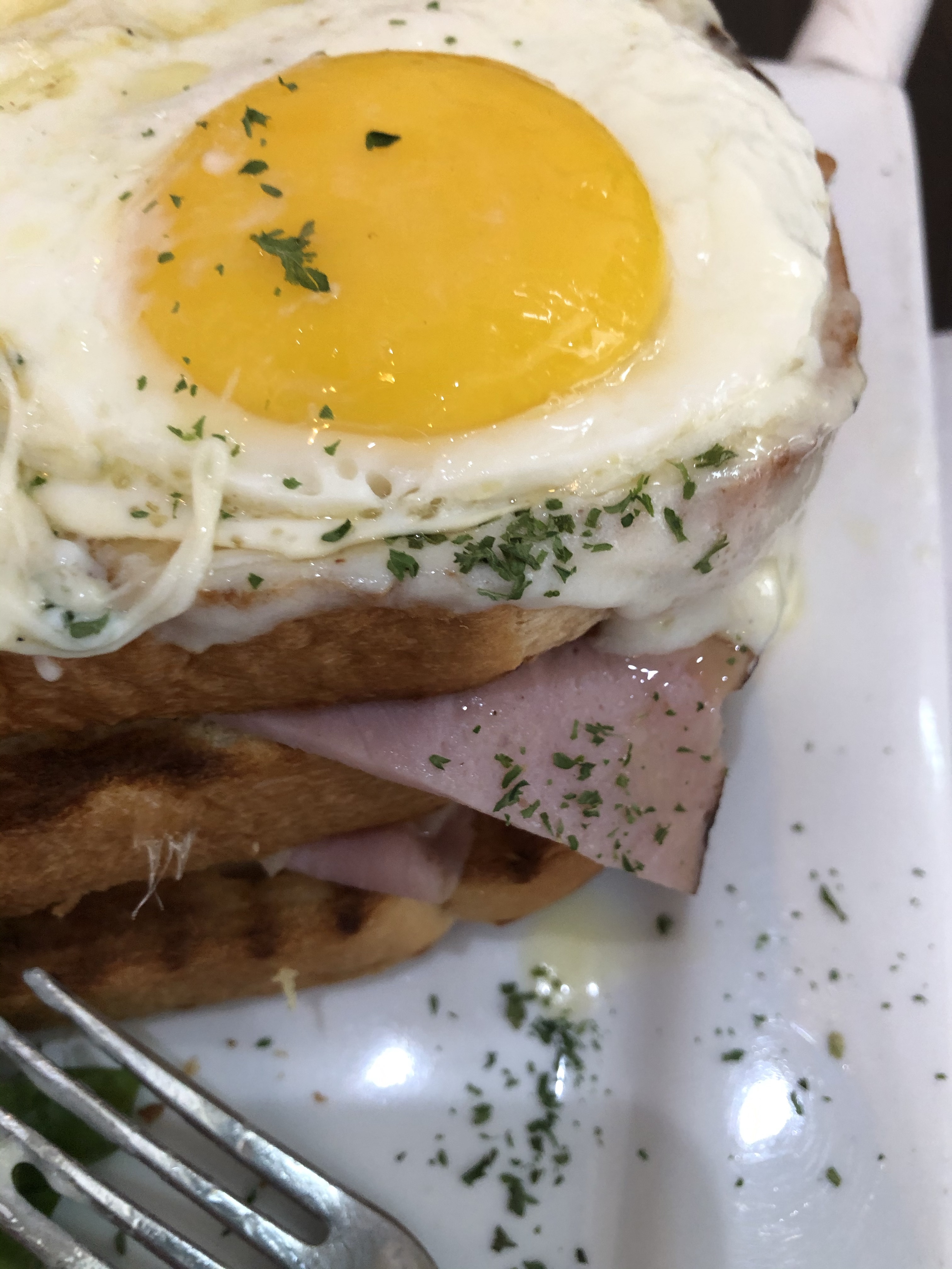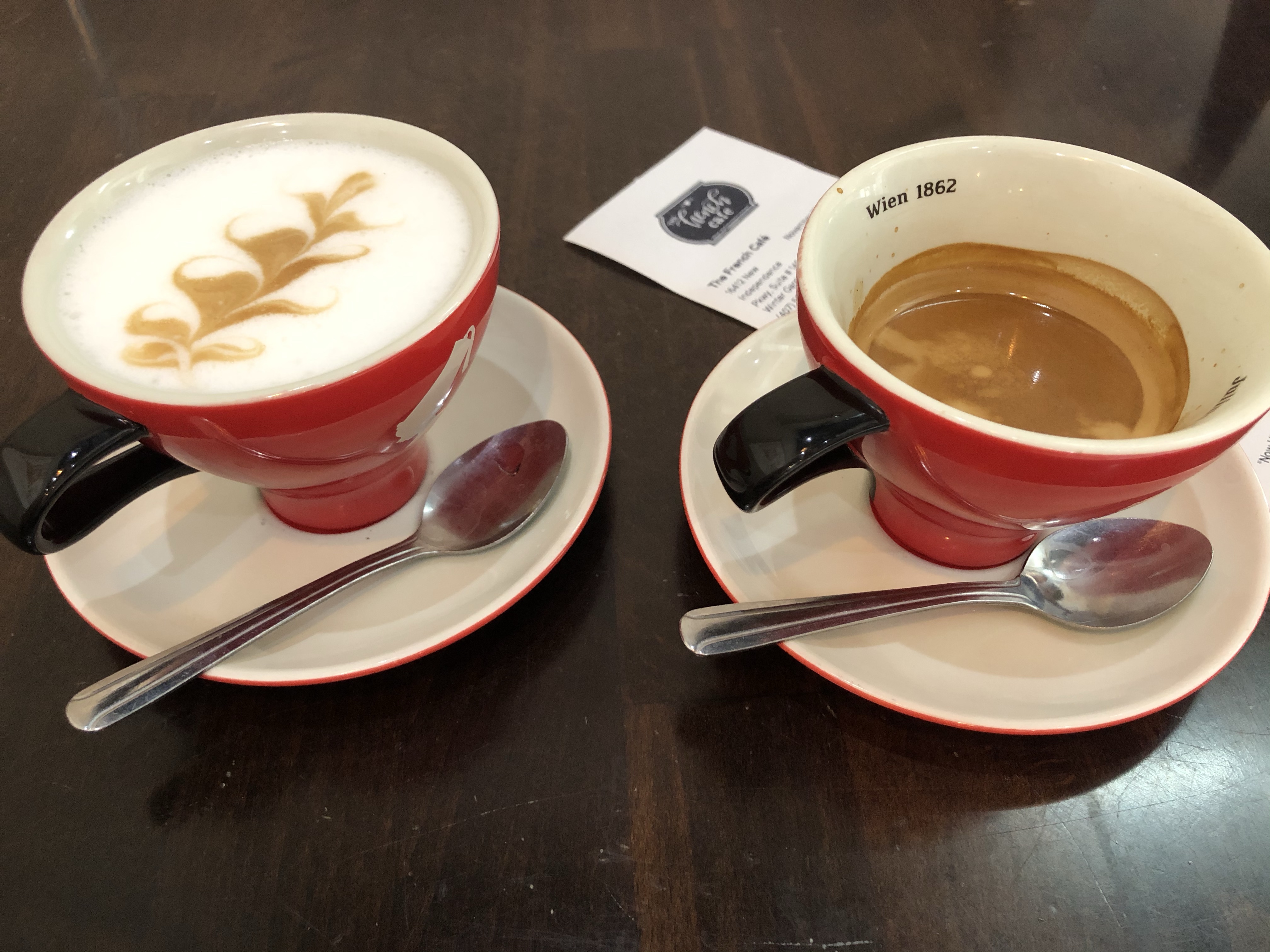 Erik and I both ordered the croque madame. When you can get a good one, there is nothing better. We were both pleasantly surprised by the size and quality of the “sandwich”. It actually had three layers of bread and LOTS of ham. I couldn’t finish mine, but for a rare change, Erik was actually full and satisfied with his brunch. Our sandwiches came with a side arugula salad with a vinaigrette dressing. We were also happy with the quality of coffee beverages. Erik almost always orders a double shot of espresso and I am all about the lattes. It was a great meal and we were both very pleased! We highly recommend that you check The French Cafe and order the croque madame!