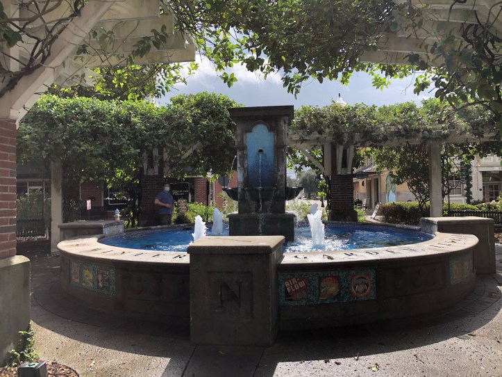 In the walk way down main street, there are several fountains all of which have little park benches or even bench swings to pause and relax at. Perfect spot for a “mask break” or to sip your coffee.