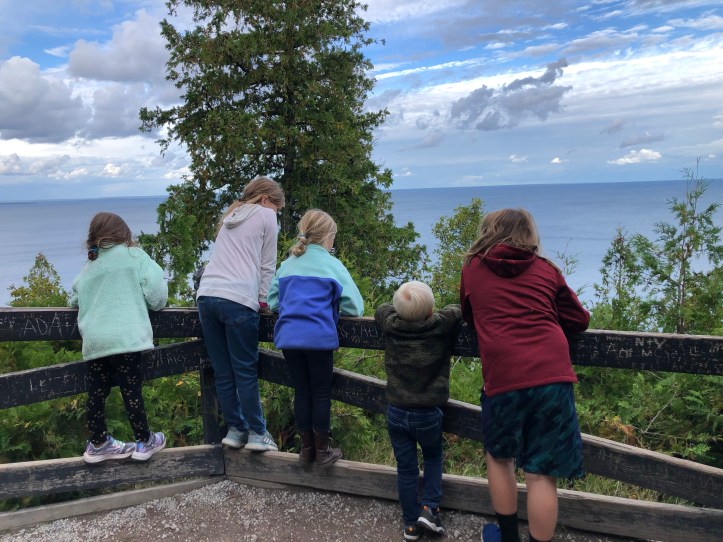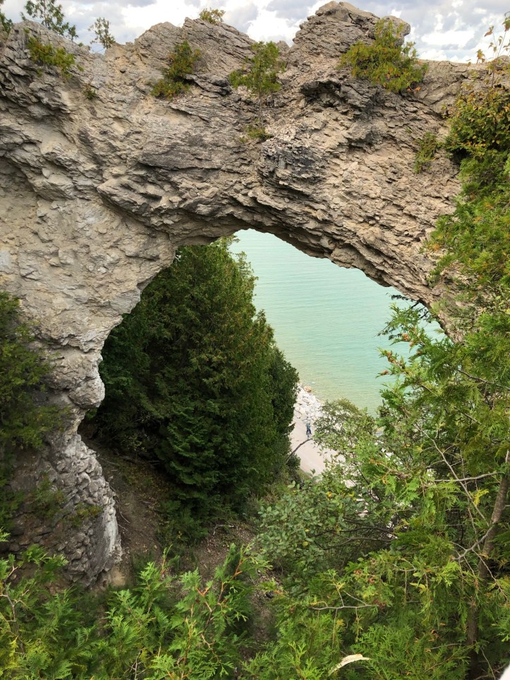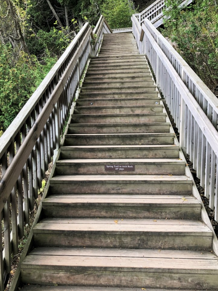 After our time at the fort (which wound up being most of the day – there is so much to see and do there!) we used the walking paths on the interior of the island to walk the short distance to Arch Rock. While we have all visited Arch Rock during a carriage tour before, we had never spent much time there and without the constraints of the tour, we were able to take our time and enjoy the lull’s between the crowds. It is an incredible sight to see and the best spot for viewing it is the middle landing of stairs. The top walk way gets you closest and when taken out to the end gives you beautiful views of the great lakes and Upper Peninsula. There is a second set of stairs to the right of the Arch that takes you to a scenic outlook. Mostly the scenery includes the tree tops of the trees directly in front of you. Arch Rock though is one of the most iconic spots on Mackinac Island and truly worth a stop. You can reach it through carriage tour, interior walking paths/roads, or the most difficult route, the 217 stair climb from the road that runs around the perimeter of the island. We walked down those stairs and even that was a challenge so choose your route carefully!