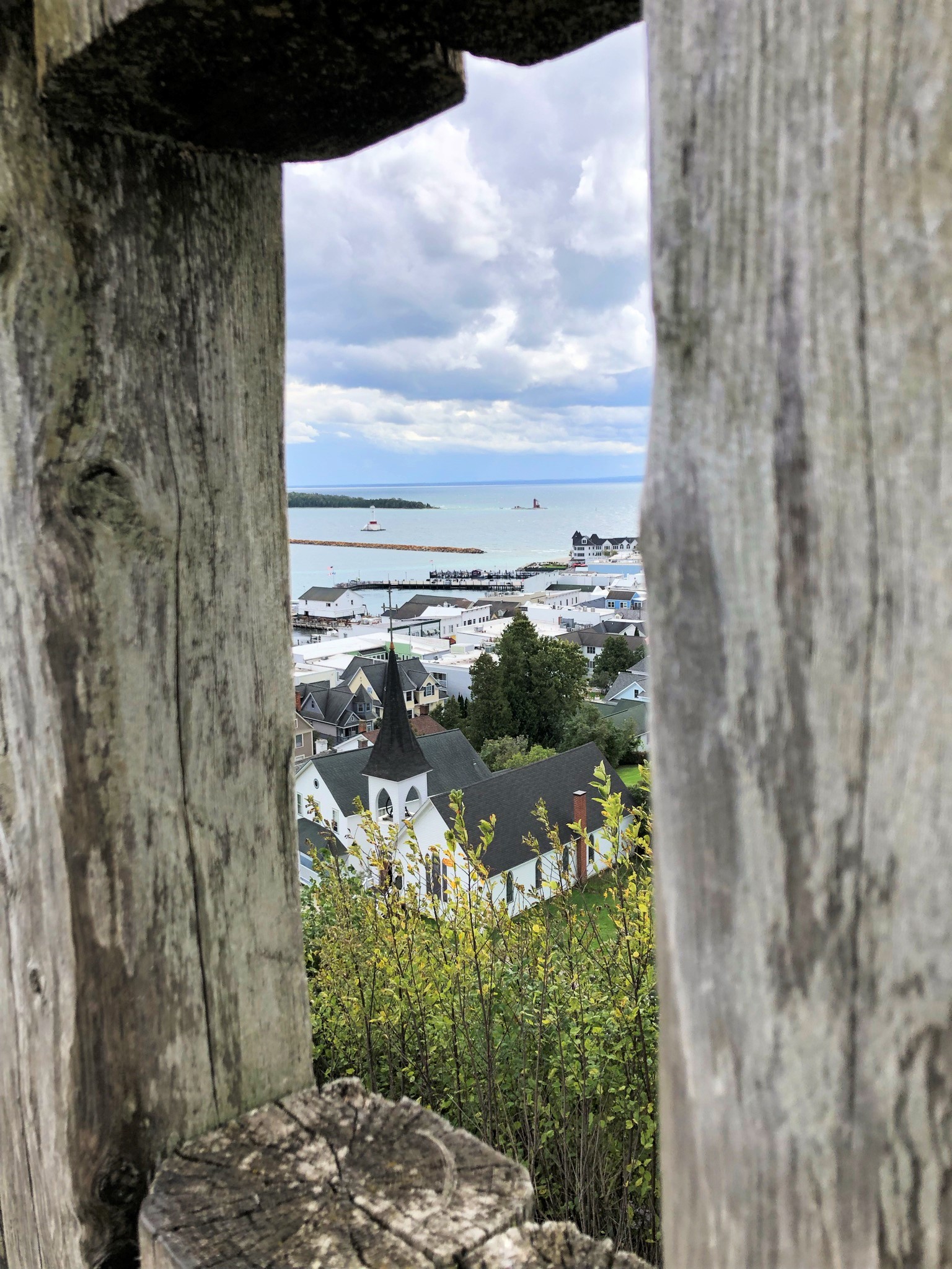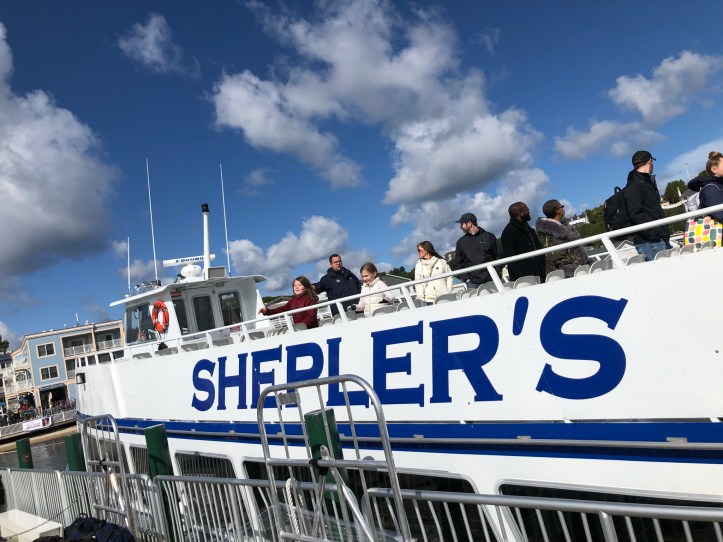 One of the elements of our trip that remained the same was our dedication to the Shepler’s Ferry. There are several other lines in town that make frequent runs to the island, but Shepler’s offers the best schedule for arrivals and departures so it has remained our go to option. We were also able to grab a discounted bundle of our ferry ticket combined with admission to Fort Michillimackinac at the ferry office so that was awesomely convenient. With our purchase we were also given coupons for bike rentals and admission to the butterfly house. Because we happened to have beautiful weather this year, some of our party elected to sit on the top deck of the ferry and enjoy some unobstructed views of both the island and the bridge. While some areas of the top deck are subject to splashing from waves, as long as it’s a nice day, the biggest risk you take up there is wind blown hair 😉 I sat in the lower cabin with Torsten and enjoyed a window seat and lots of spray on the windows. *Pro tip, when riding to the island grab a seat on the port side (when standing at the back, facing front it will be the left side) for great views of the Mackinac Bridge!*