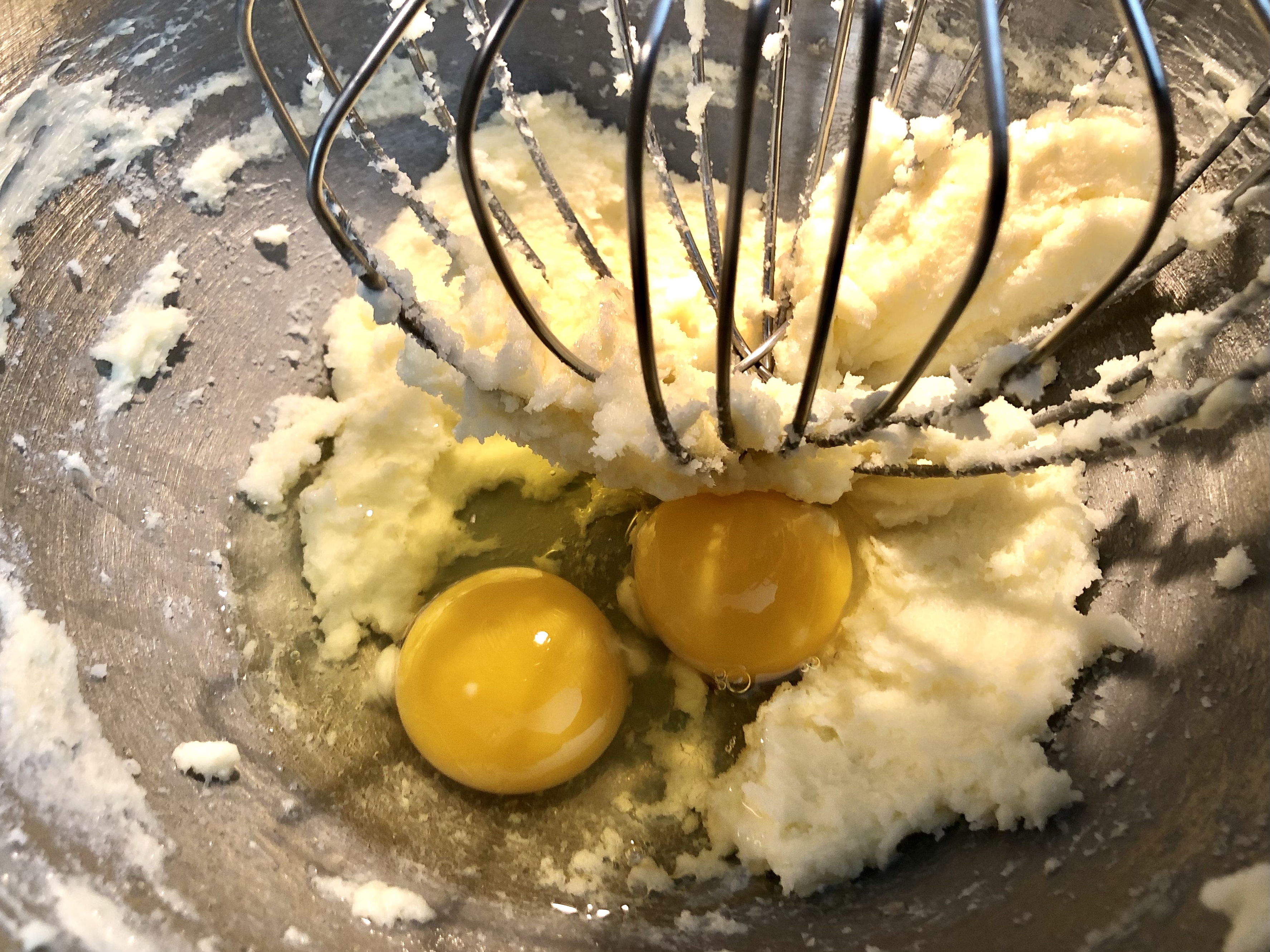 Cream together butter and sugar until smooth. Add in eggs one at a time.
