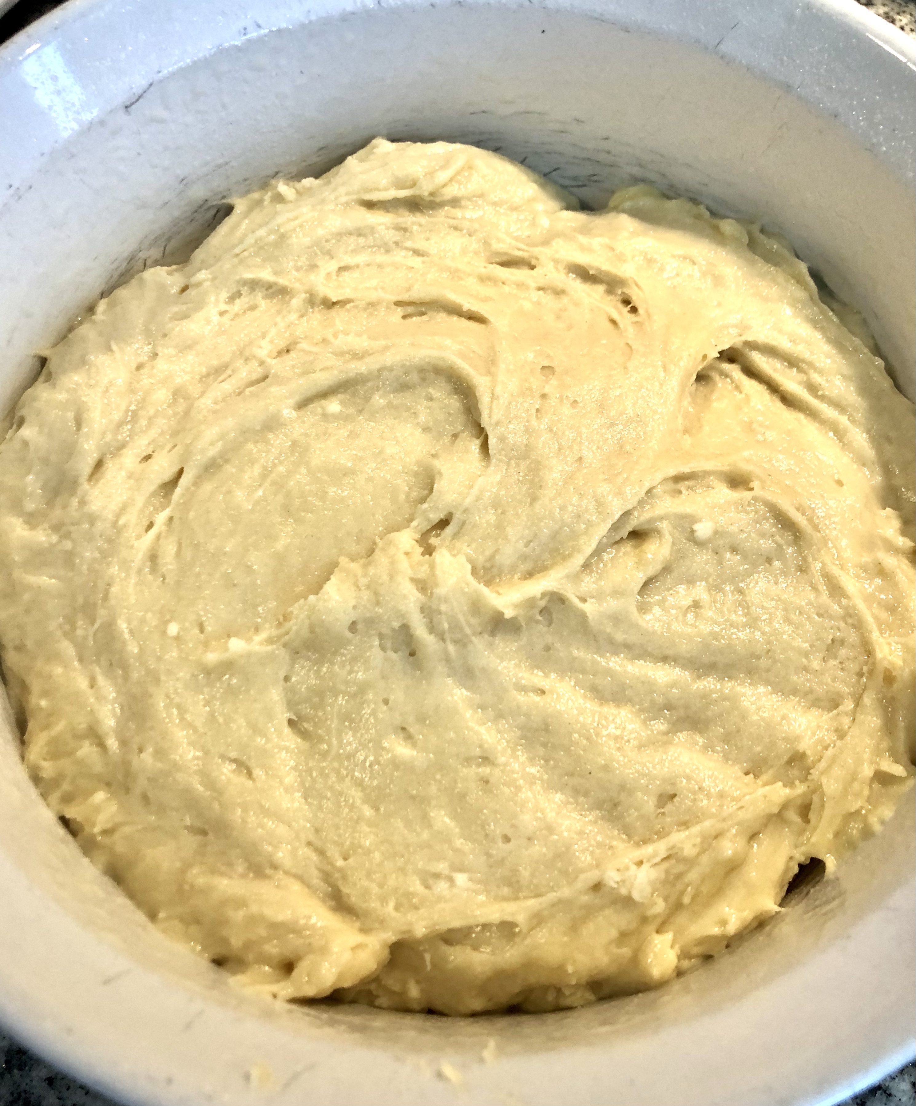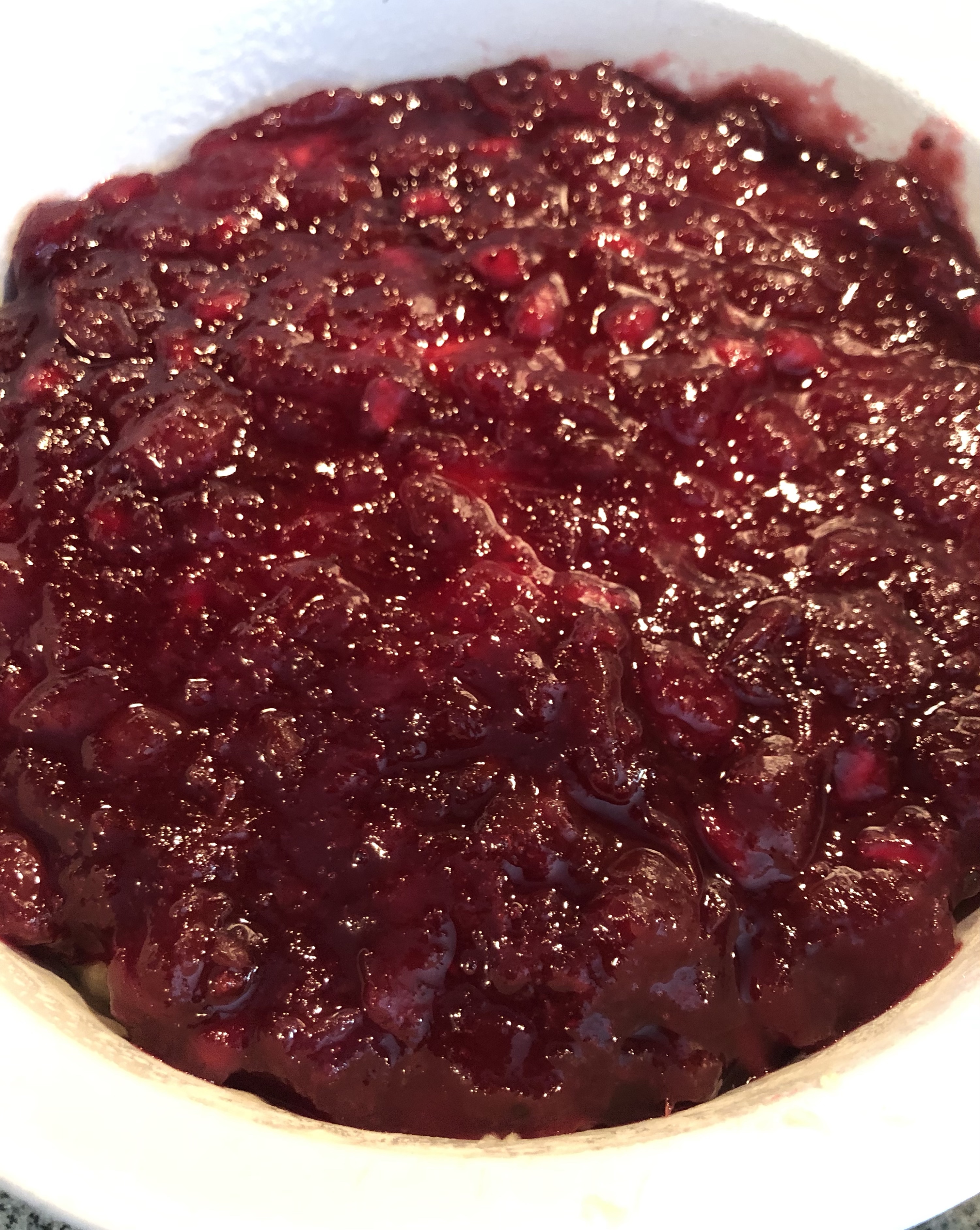 Pour batter into the greased pan. Next, pour on the cranberry in an even layer covering the batter.