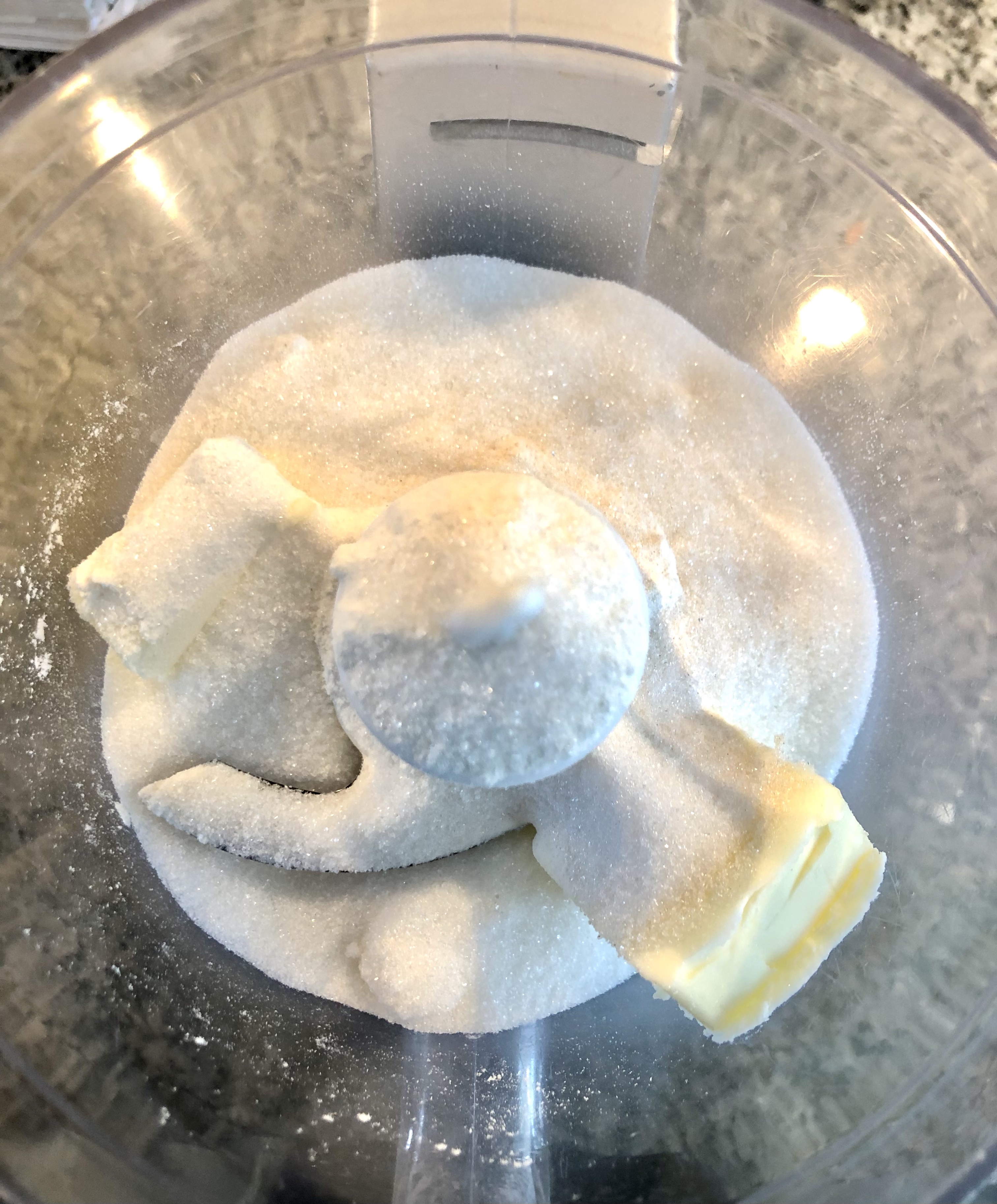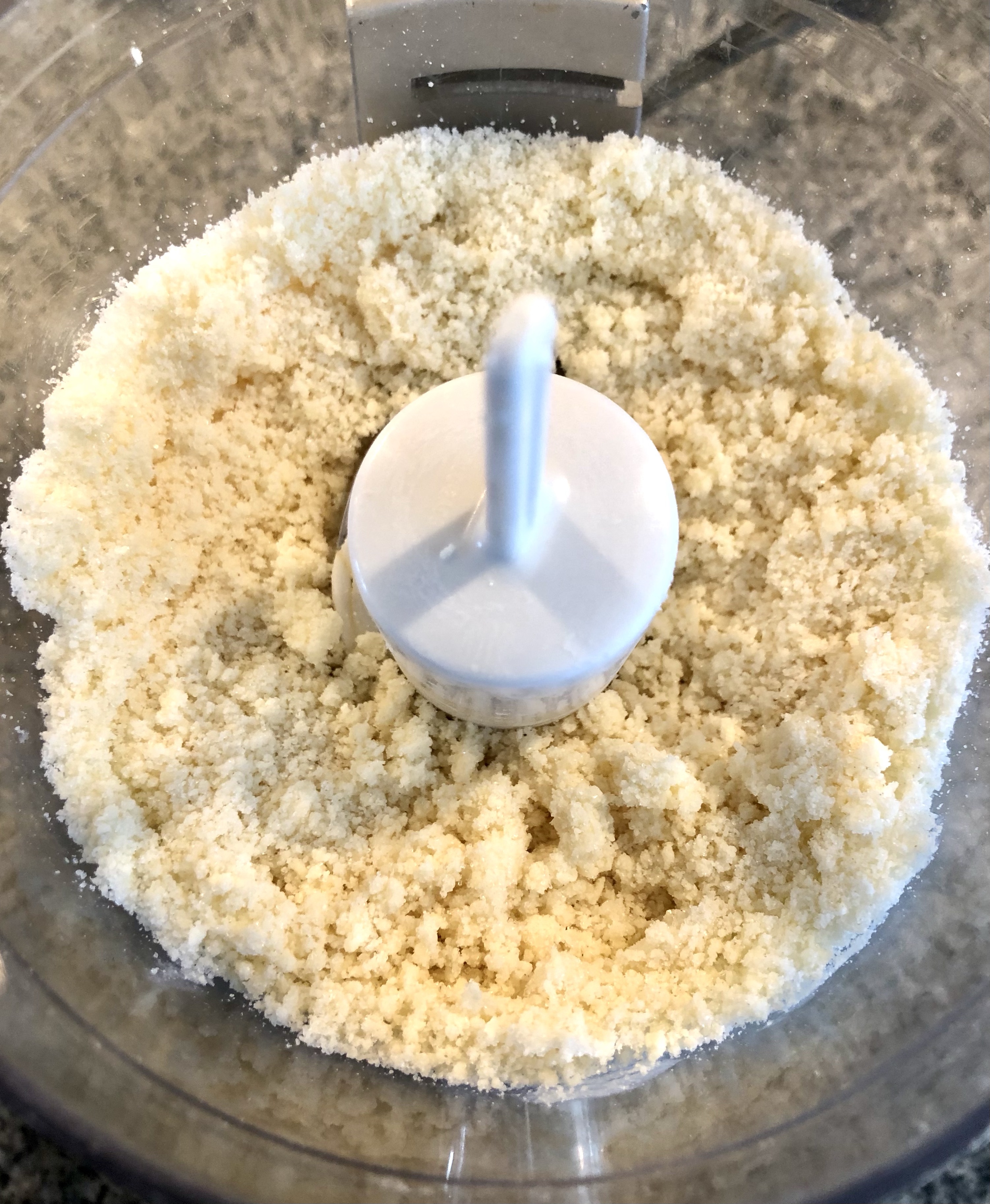 One of my favorite kitchen short cuts: my mini chopper as a replacement for a pastry cutter! Just make sure your butter is very cold and watch that you don’t over mix. If you “chop” for too long, the butter will begin to clump up. Stop when your butter, flour, and sugar resemble fine crumbs.