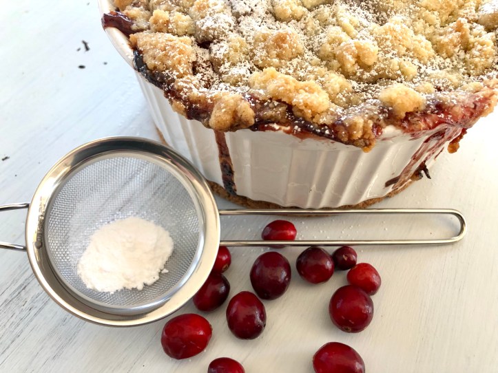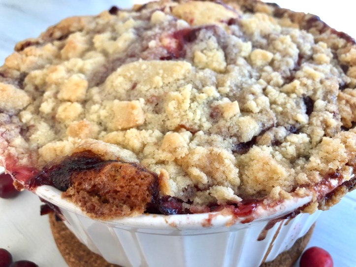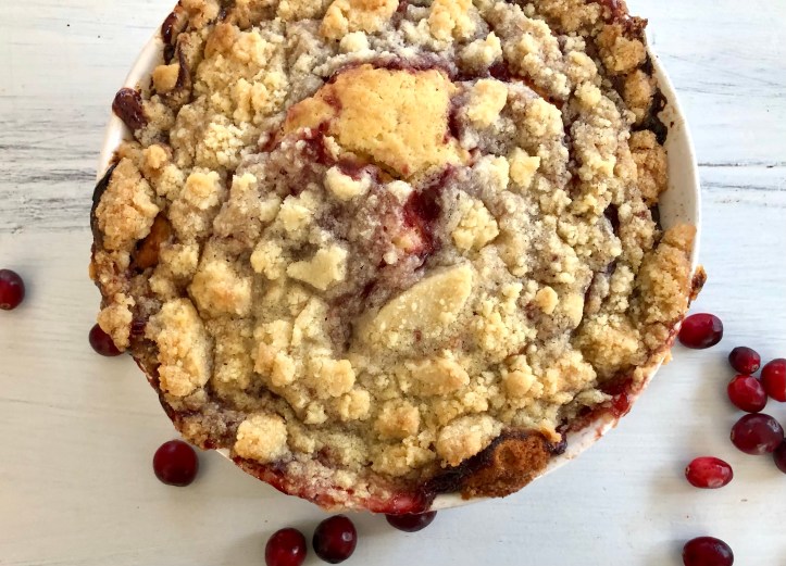 If your baking dish is filled to the top, consider setting it on a cookie sheet to catch any overflowing juices from the cranberries. Place in a 350 degree oven and check in around 35-40 minutes. Crumb topping should be golden and cake should be fully set.