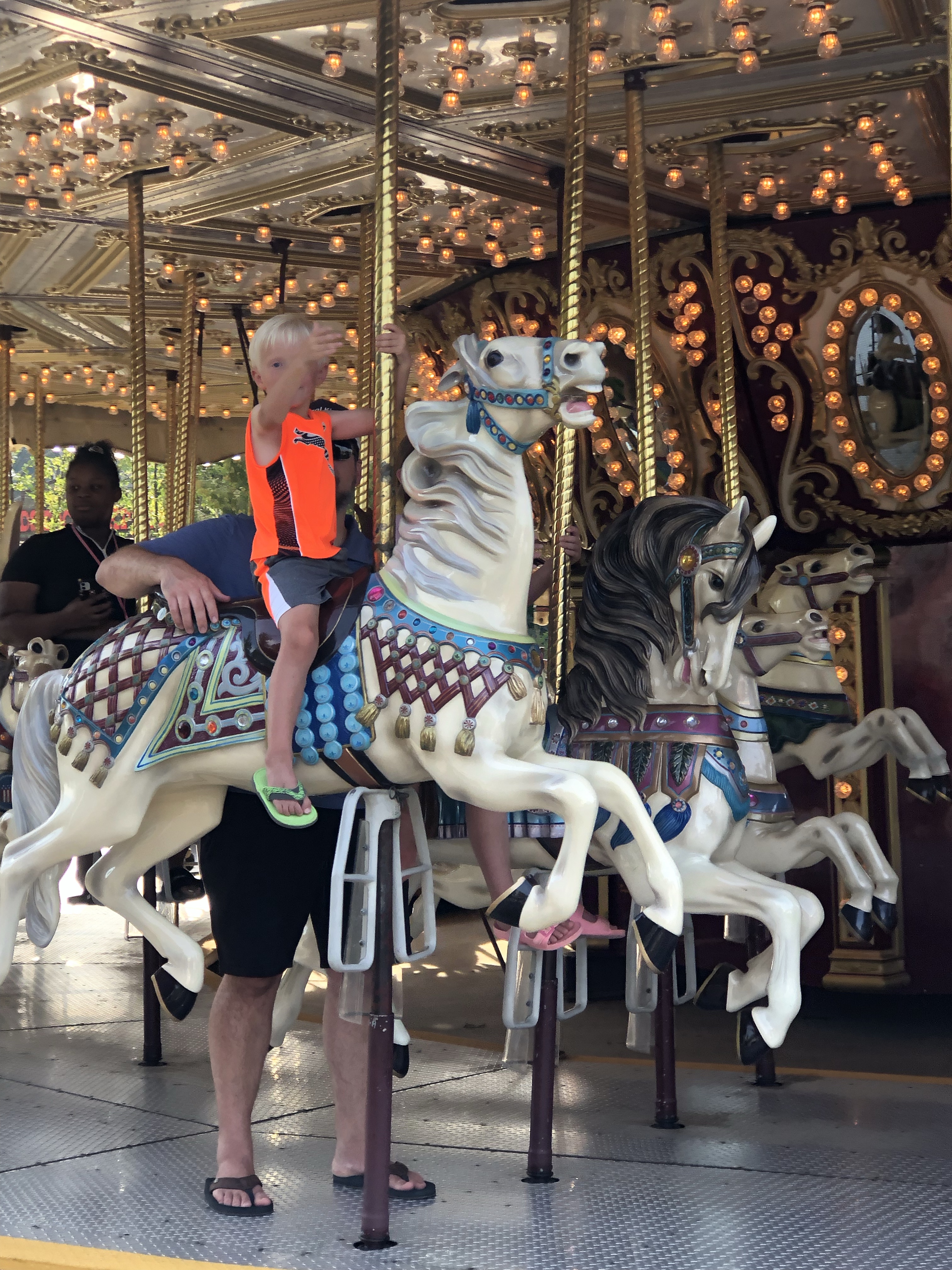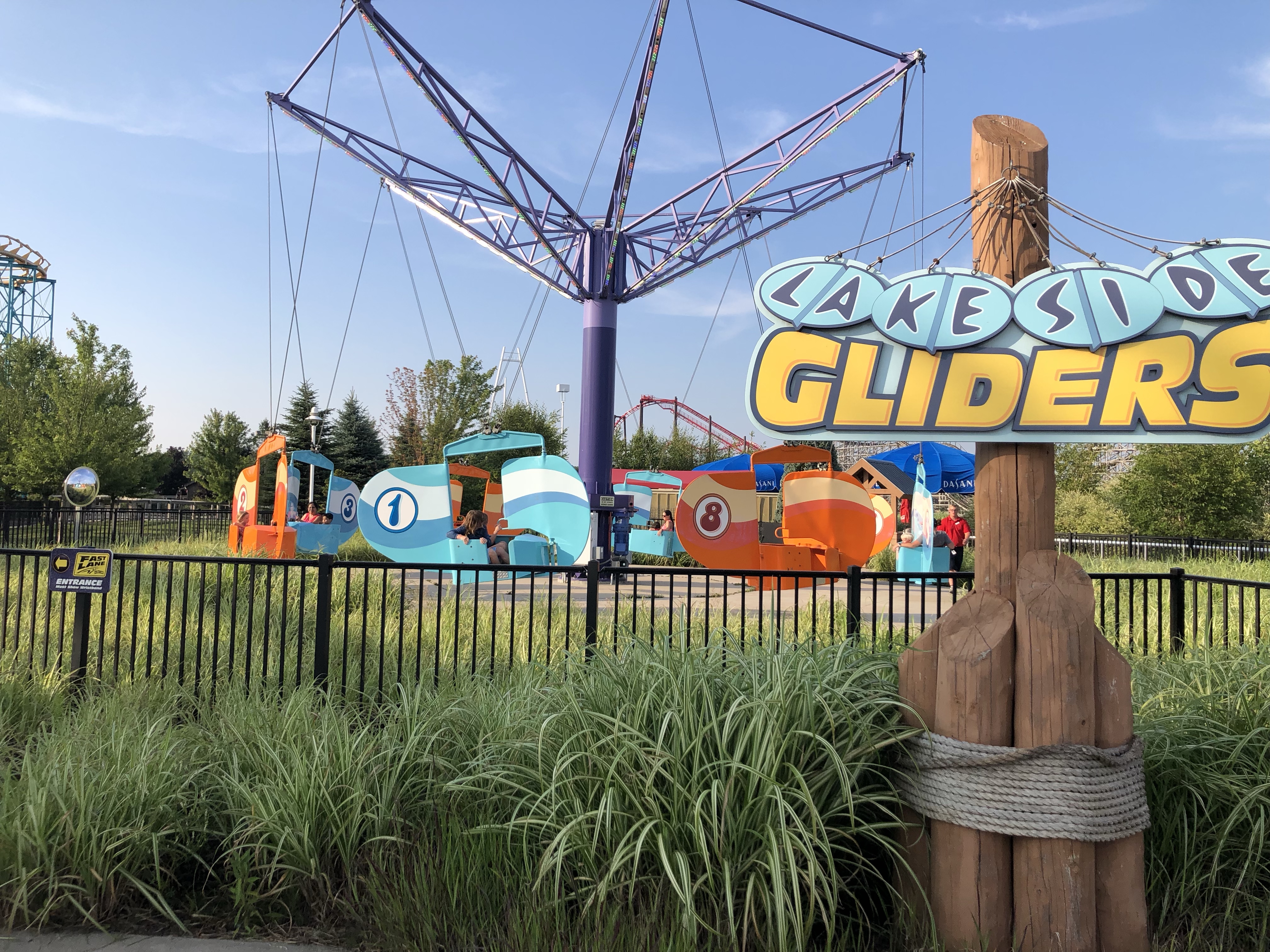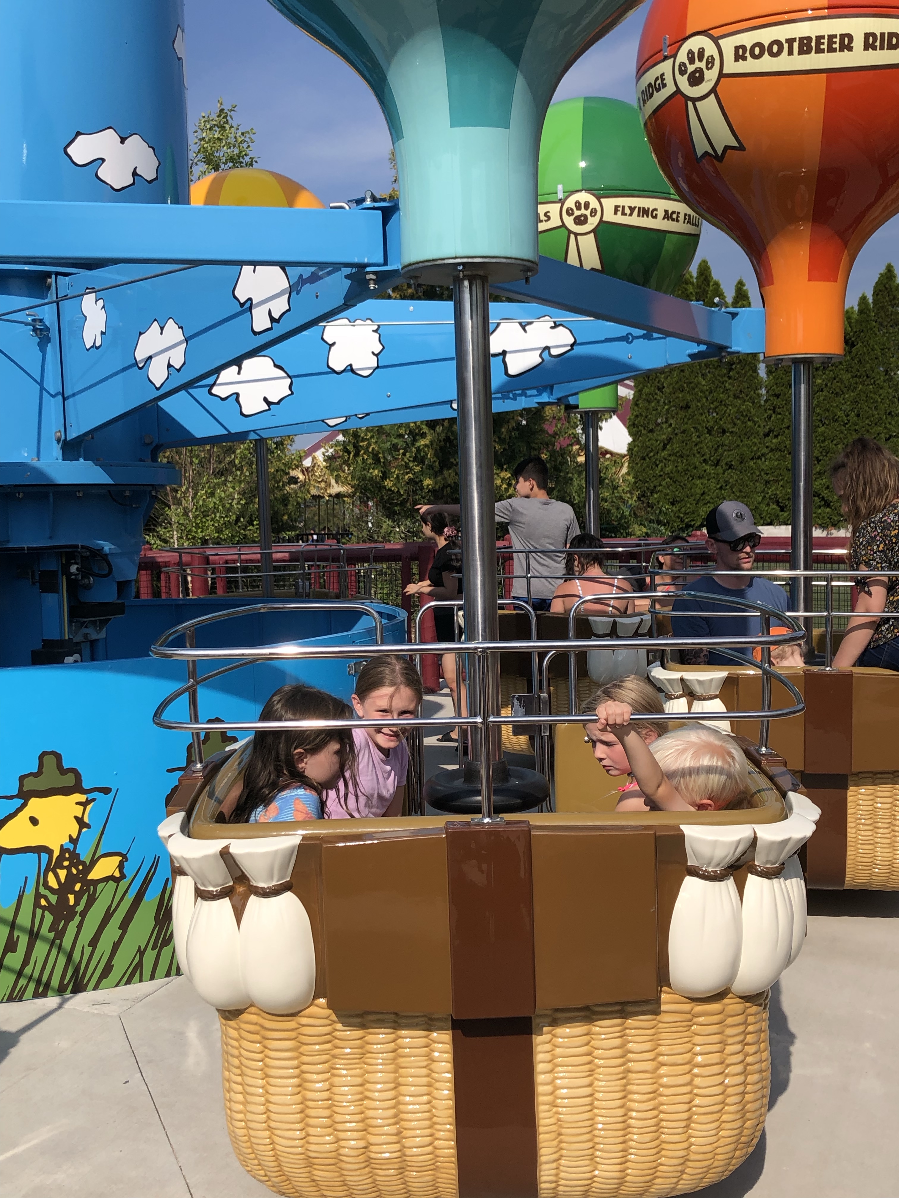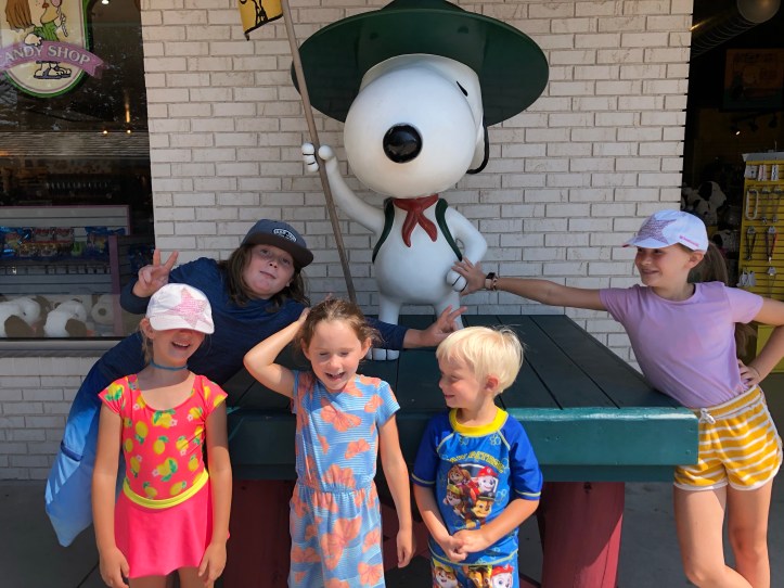 The water park closed at 6:00p that day and the amusement park closed at 7:00. We fully intended to stay in the water park until they closed that section, but our crew decided to break out early and grab some dinner before enjoying the recently added Camp Snoopy area! It was actually perfect timing, we probably left around 5:00 and the Snoopy rides were basically empty. The kids got on every ride without waiting and were able to ride each one multiple times all while intermittently pausing to grab a chicken tender or corn dog nugget. I don’t know if it’s just because it’s right next to the water park, or if it’s just where people want to check out Snoopy after they dry off, but there was a big flood of people that rushed into Camp Snoopy right as the water park closed. I was glad we made it there earlier and were able to get in lots of rides before the wait times increased.