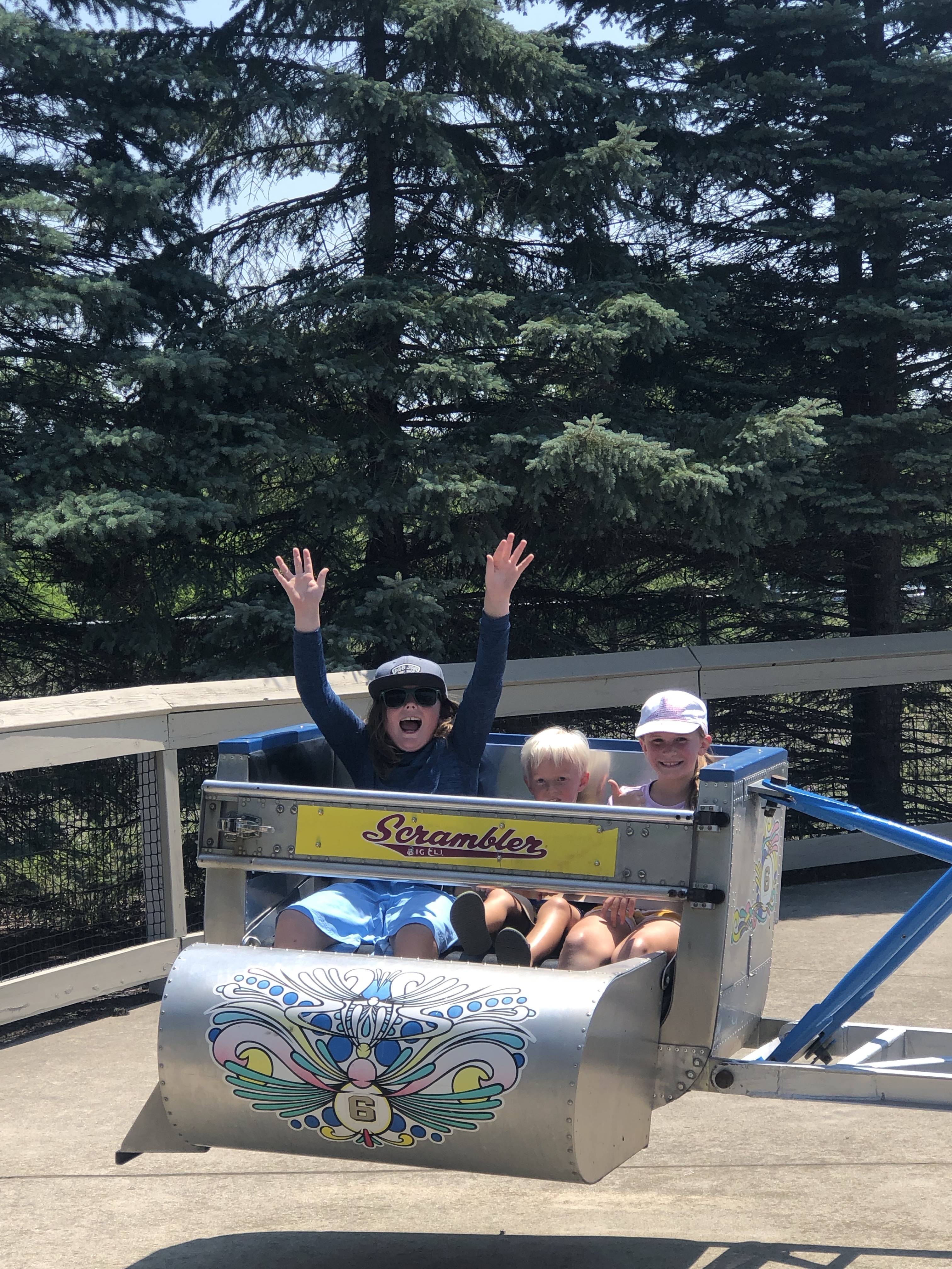 The park opened at 11:00a and we arrived shortly after. *Quick tip* cell reception there is spotty so if you can print your tickets ahead of time, I definitely recommend it. It will help you avoid awkward or sticky situations at the park entrance trying to load your digital tickets. We brought one big bag that held all of our life jackets, towels, and change of clothes. I also carried on me my amusement park size purse (aka, the smallest thing possible to fit a wallet, phone, and hand sanitizer). The waterpark side did not open until noon, so my sister and I went and waited at the gate so we could be in the first wave (no pun intended) of people admitted and secure a table with an umbrella to stash our big bags and use as homebase. Meanwhile, the dads took the kiddos to start with several of the carnival style rides. It was a perfect day: the weather was warm- but not hot, and the lines were pretty short! The bigger rides and roller coasters had more significant wait times, but since all of our kids were ten and under, it did not affect us much! After we dropped the bags off, my sister and I went back to the amusement side of the park to meet back up with rest of the crew and enjoyed rides for another hour or so.