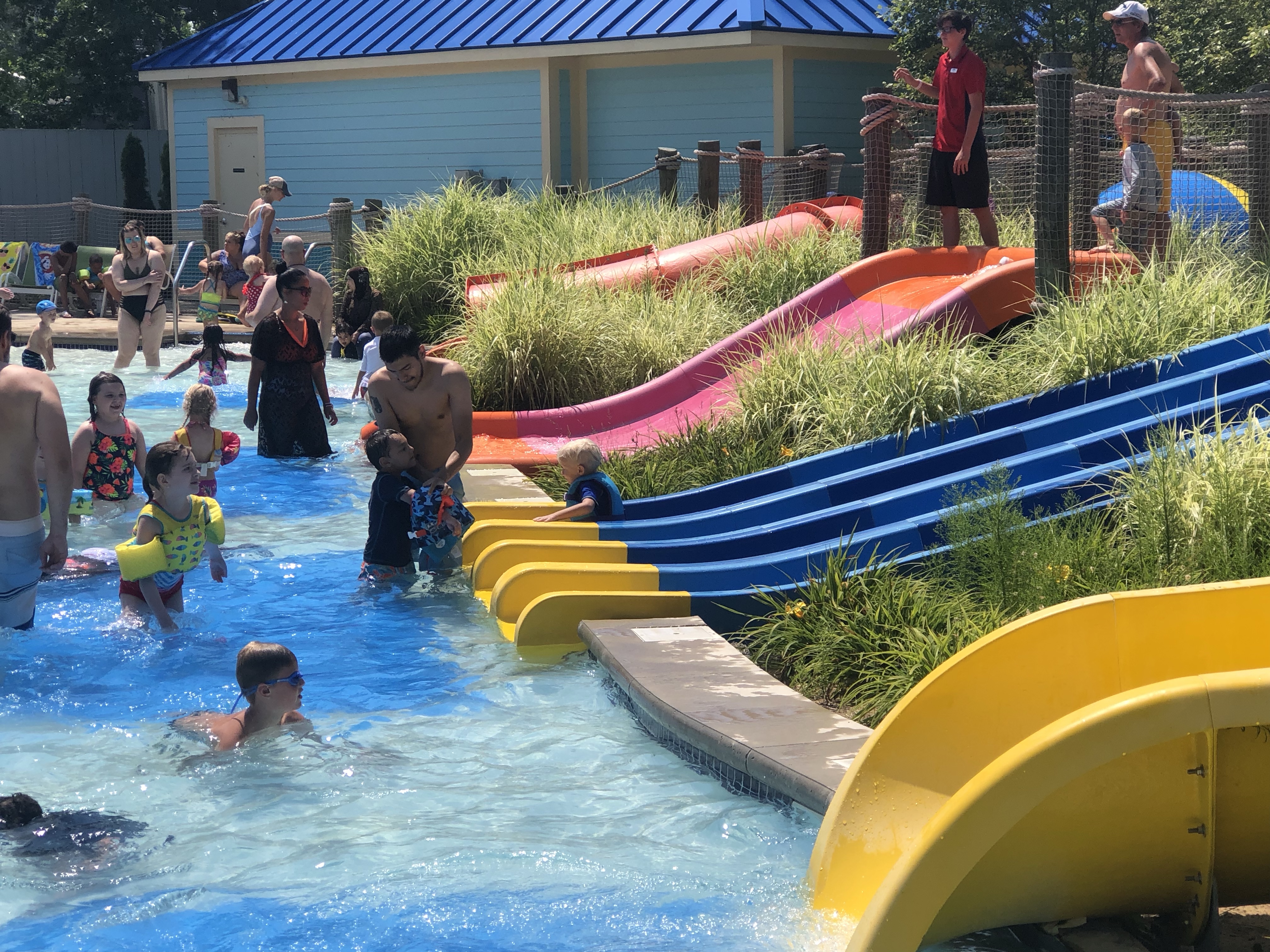 There were lots of different areas in the water park which offered a little bit of something for everyone! The biggest hit across the board was the wave pool by far! That was the one area that everyone was happy and had a good time together. It was PACKED though, so it was a stressful area as far as I was concerned! There are lots of lifeguards on duty there, but I don’t like to rely soley on them if I can help it. The big kids loved this area (below on the left) with bucket dumps, medium sized water slides, and lots of things to climb!